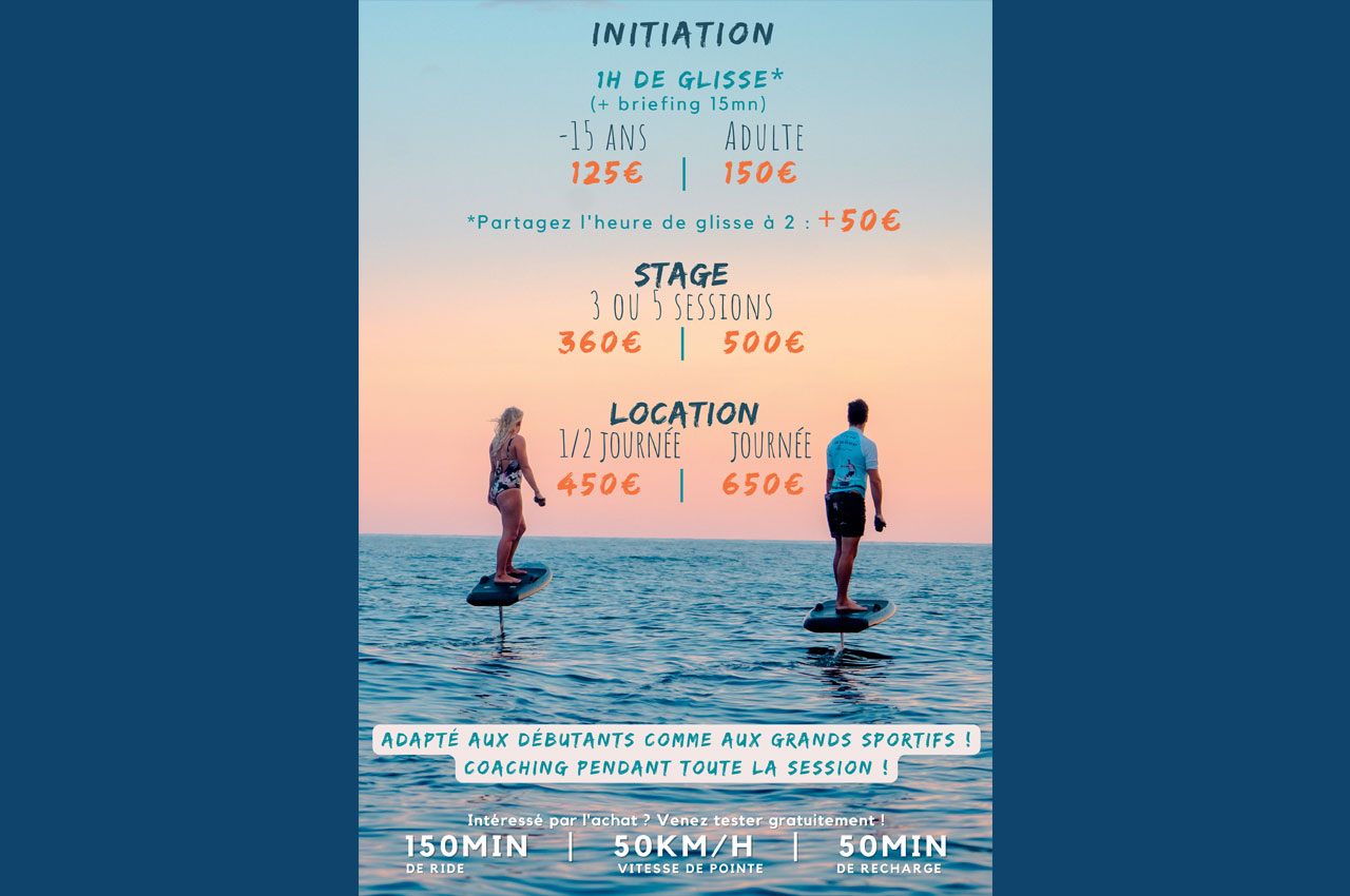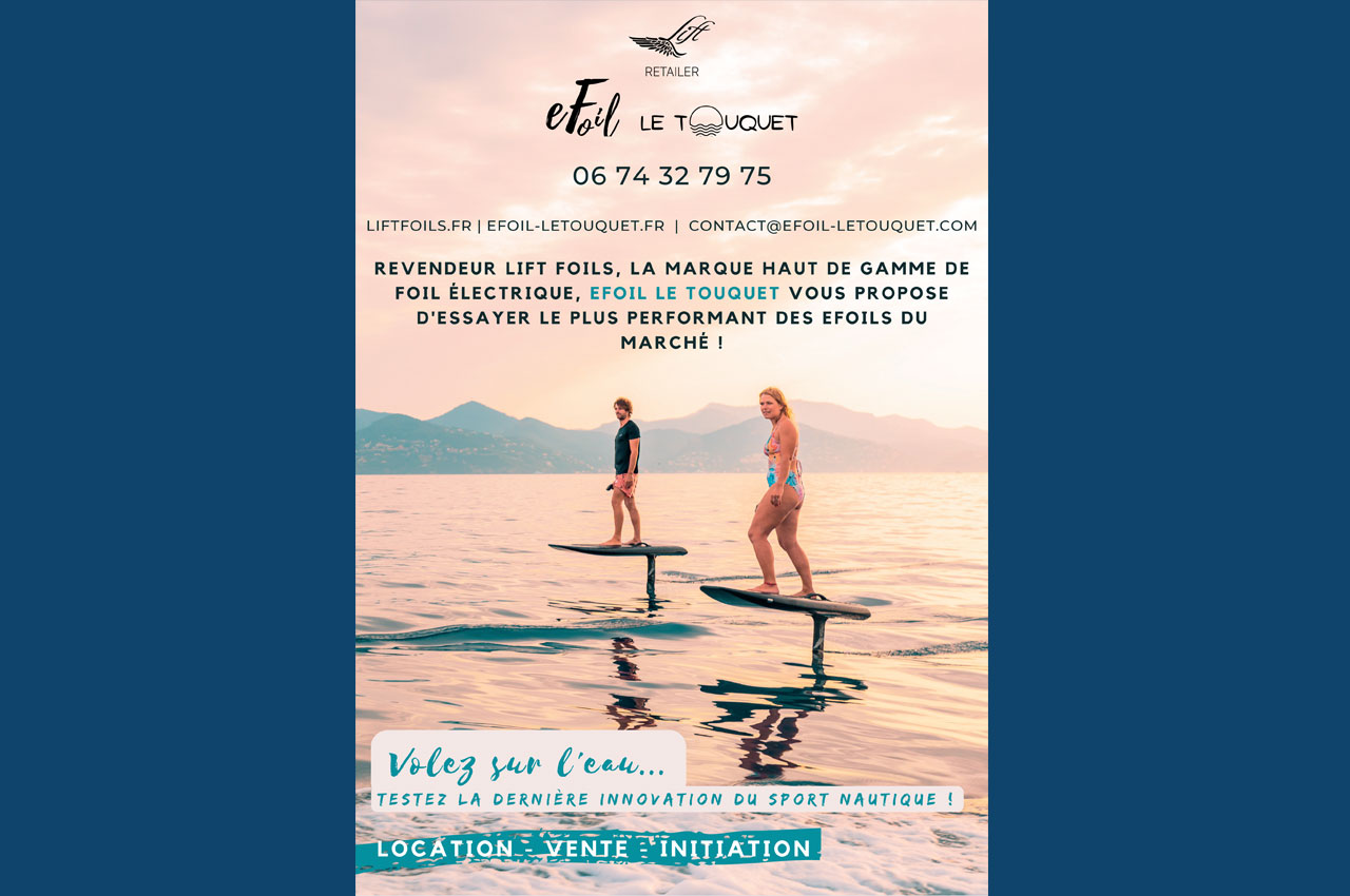 2 À propos À proximité Retour à la liste Les eFoils débarquent au Touquet-Paris-Plage ! Le foil électrique (ou eFoil) est un surf volant au dessus de l'eau 100% électrique. A la pointe de la technologie, les eFoils LIFT utilisent une batterie lithium-ion dernière génération pour alimenter son moteur électrique silencieux. Le système est monté sur un hydrofoil entièrement en fibre de carbone et est contrôlé par une manette sans fil Bluetooth très réactive.Le foil électrique est une activité complètement respectueuse de l'environnement. 100% électriques, les eFoils n'émettent ni émission ni bruit.La pratique du eFoil est adaptée à tous : pour les débutants, à la recherche d’une expérience fun et amusante, comme aux grands sportifs, à la recherche de sensations fortes ! La prise en main est simple et rapide. En suivant les conseils de nos experts, la plupart des participants volent au-dessus de l’eau dès leur première session !Programme des initiations :Rendez-vous à notre chalet eFoil sur la base nautique nord de la Canche. Nous vous accueillons et vous équipons (gilets, casques, combinaisons...).Après vous avoir donné tous nos conseils et les règles de sécurité il sera temps de vous mettre à l'eau !C'est parti pour 1 heure complète de glisse ! Le eFoil est assez facile à prendre en main, au bout d'environ 30min vous commencerez à vous mettre debout puis à voler au dessus de l'eau. Nous vous coacherons pendant toute la session afin de vous permettre de progresser plus rapidement. Nous prendrons également des photos et vidéos de votre session ! Au bout d'1h nous rejoindrons la base.Les créneaux dépendent de la marée.Matériel utilisé : Nous sommes affiliés et revendeurs de la marque haut de gamme leader du marché : LIFT FOILS depuis 4ans. Lift foils, construit des foils (sans moteur) depuis plus de 15ans et est l'inventeur du eFoil dont elle détient tous les brevets.Les eFoils Lift sont profilés comme des surfs, c'est aussi la seule marque à proposer des eFoils fabriqués entièrement en carbone ce qui leur permet d'être beaucoup plus techniques, légers et durables que ceux de ses concurrents, offrant une plus grande maniabilité et de meilleures sensations de glisse et de vol.C’est grâce à la performance et la technicité de nos eFoils LIFT nous permet de fidéliser de nombreux clients. En effet, les eFoils LIFT se déclinent en 4 modèles dont la différence majeure est la taille de la planche (et donc de volume) mais aussi les différentes tailles d’ailes et de mâts. Cela permet d’une part d’adapter le eFoil au gabarit et à l’expérience en sport de glisse du client. D’autre part, cela permet d’offrir à nos clients une expérience ludique et évolutive. Ces derniers peuvent ainsi progresser au fil des sessions et des stages que nous proposons et évoluer sur des eFoils de plus en plus techniques.Forte de son expertise en surf foil, wing foil, kite foil, Lift Foils est la marque qui propose la plus large gamme d’ailes. Ces ailes peuvent être utilisées pour l’ensemble des disciplines foil et pour le eFoil, ce qui permet de s’adapter à tous niveaux et aux différentes utilisations souhaitées (virages serrés, vitesse, surf de la houle, grande courbes, stabilité pour débutants...). Cela permet aussi aux amateurs de progresser et d’essayer des produits de plus en plus techniques.Activité à partir de 10ans, jusqu'à 125kg.