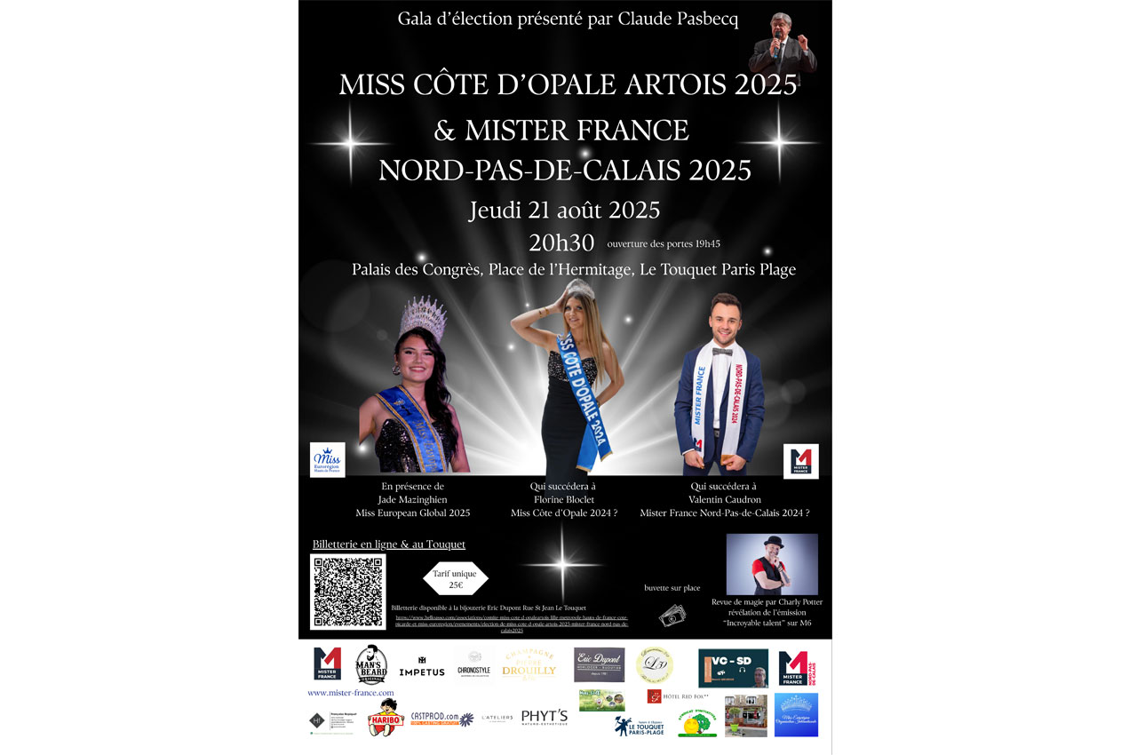 2 À propos Retour à la liste 53ème Election Miss Côte d'Opale et élection de Mister France Nord-Pas-de-Calais.Dès 20h30 au Palais des Congrès - Auditorium Victor BoucherOuverture des portes à 19h45.Une billetterie sera ouverte à la Bijouterie Éric Dupont dès le 1er août 2025.Tarif unique : 25€Buvette sur place.