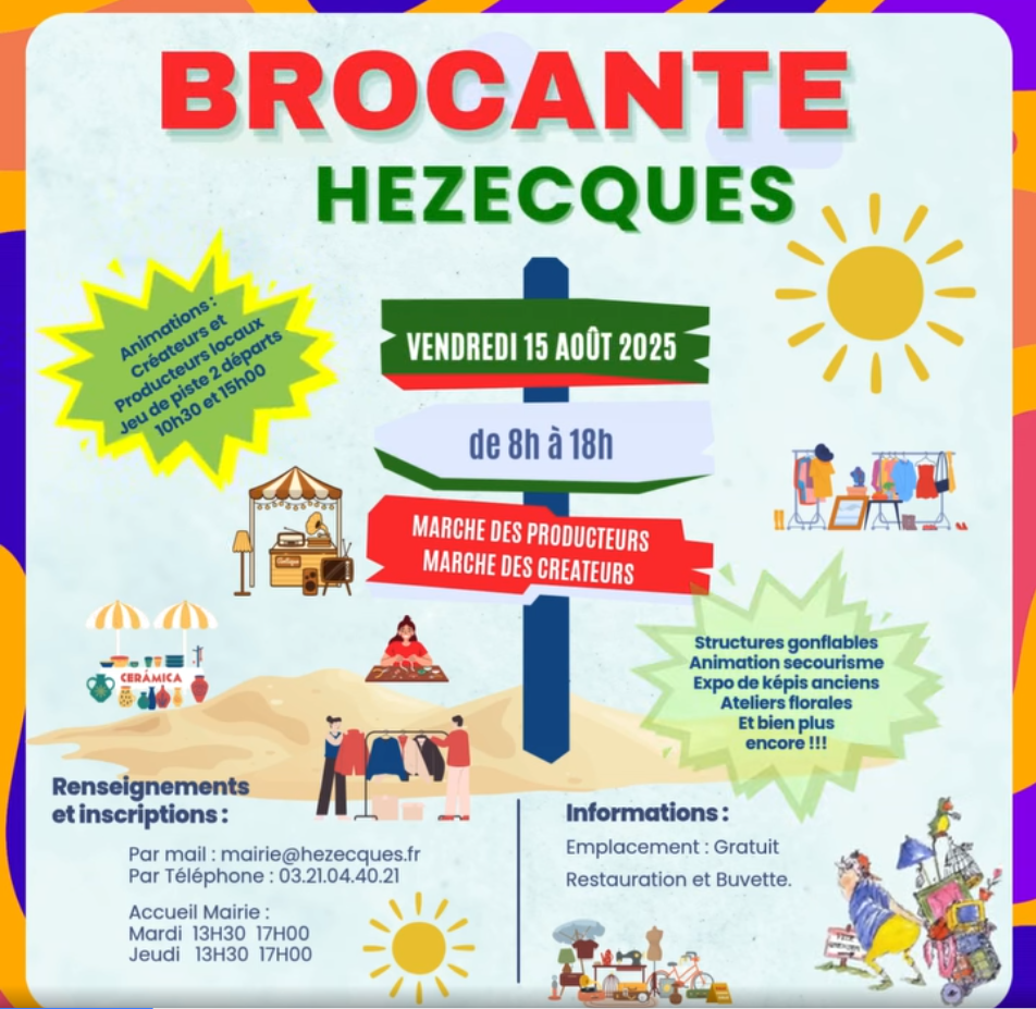 À propos Retour à la liste Rendez-vous le vendredi 15 août à 8h à Hézecques pour sa brocanteAu programme : marché de producteurs et de créateurs structures gonflables exposition de képis anciens...et encore bien d'autres choses ! Renseignements et inscriptions : mairie@hezecques.fr 03 21 04 40 21 Informations : emplacement gratuit restauration et buvette sur place