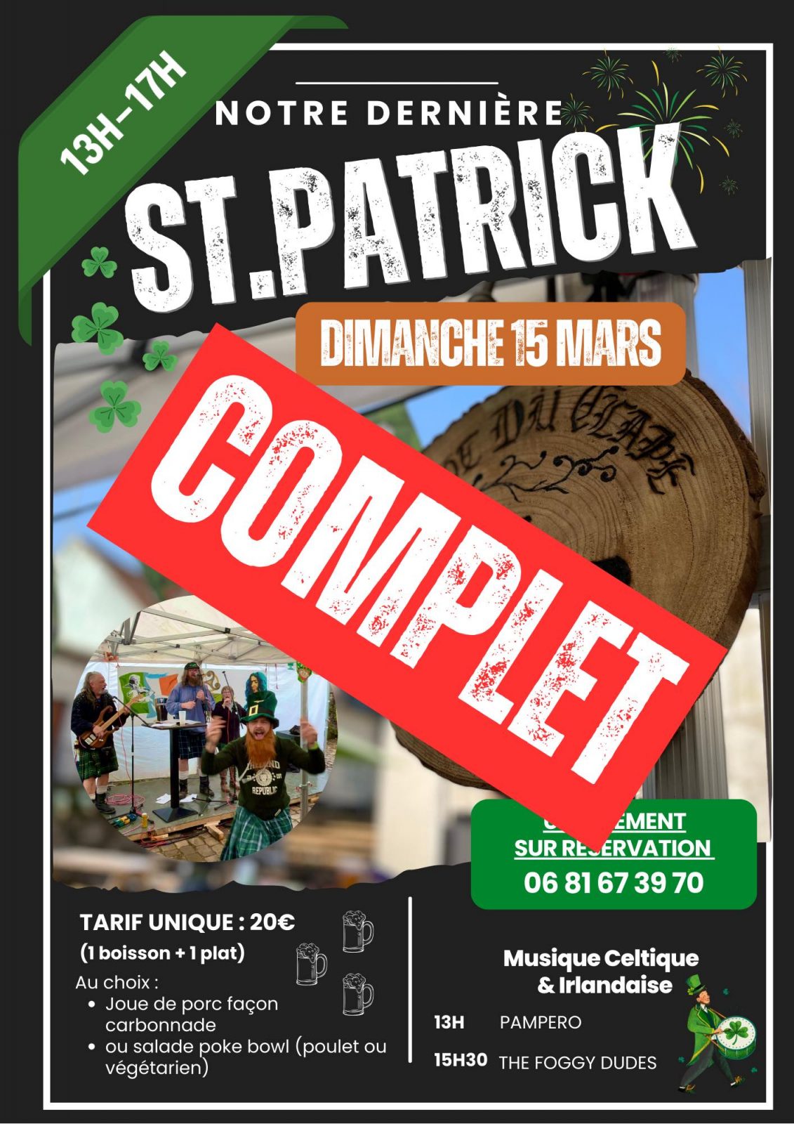 À propos Retour à la liste Fêtes de la Saint-PatrickDimanche 15 mars de 13h à 17hLe Pot du Clape - Montreuil-sur-Mer----------------------Musique celtique et irlandaise13h : PAMPERO15h30 : THE FOGGY DUDES-Repas tarif unique : 20€ (1 boisson + 1 plat)Au choix : Joue de porc façon carbonnadeou salade poke bowl (poulet ou végétarien)Réservations : 06 81 67 39 70Crédit : Le Pot du Clape
