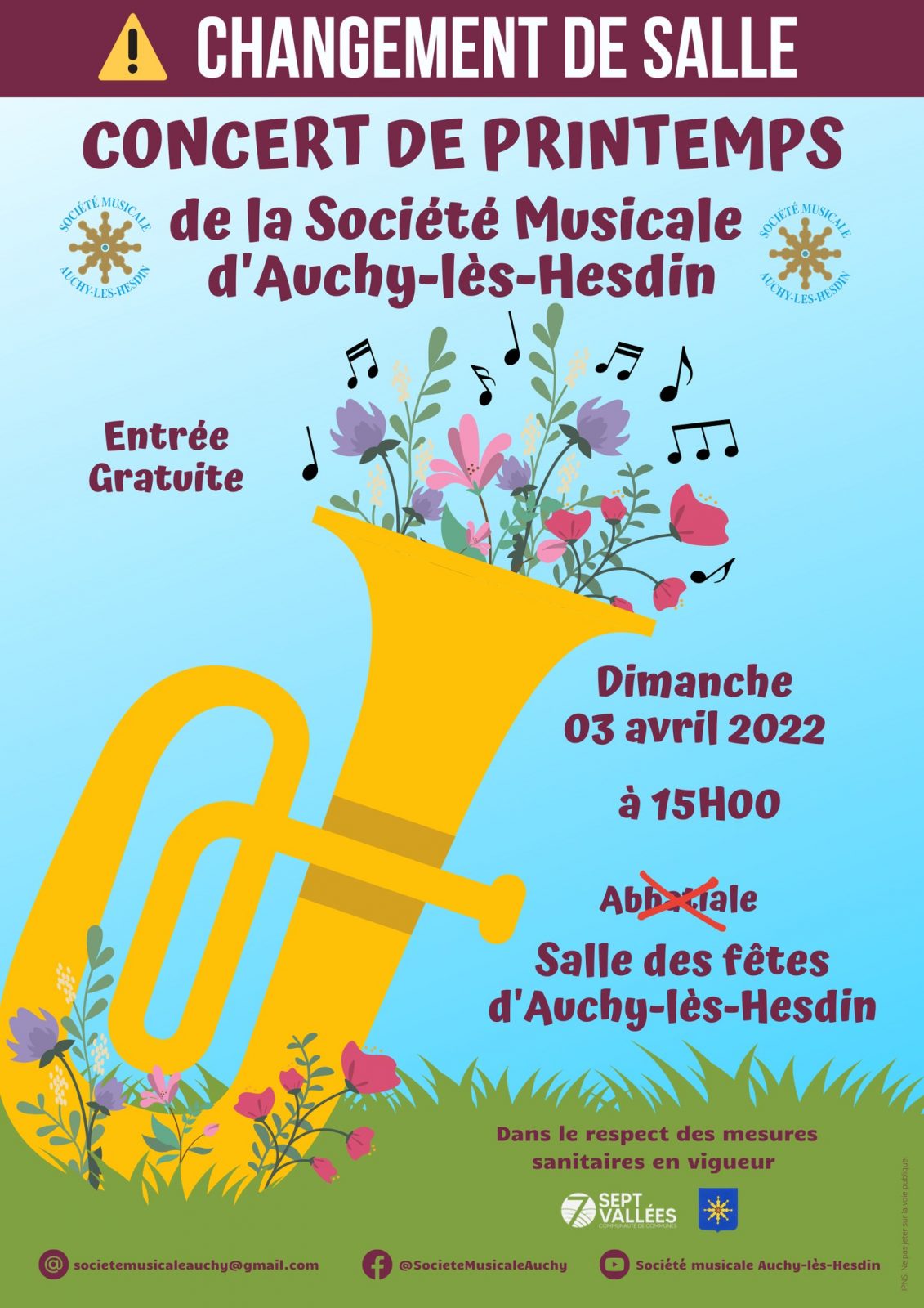 À propos Retour à la liste Venez écouter la Société Musicale d'Auchy-les-Hesdin en concert, ce dimanche 3 avril, à l'Abbatiale d'Auchy-lès-Hesdin. Un rendez-vous musical labellisé "7 Chez Nous" à ne pas manquer !Respect des règles sanitaires en vigueur.🎫 Entrée Gratuite⚠ ATTENTION CHANGEMENT DE SALLE : le concert se déroulera à la salle des fêtes d'Auchy-lès-Hesdin et non à l'Abbatiale.