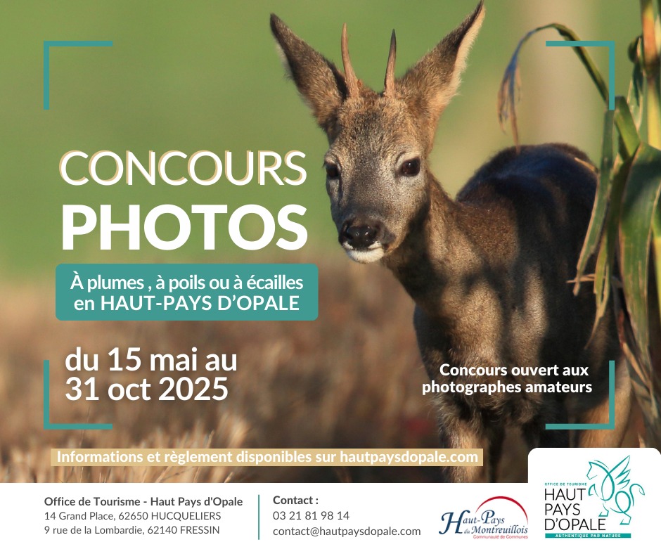 À propos Retour à la liste Avis aux amateurs de photographie, l’Office de Tourisme Haut-Pays Côte d’Opale lance son traditionnel concours photos. Cette année la thématique n’est autre que “À plumes, à poils ou à écailles en Haut-Pays d’Opale”🌿La faune locale est à l’honneur — qu’elle soit sauvage ou domestique ! Chevreuils au détour d’un bois, lapins, chevaux boulonnais majestueux, chiens complices, animaux de la ferme… toutes vos rencontres sont les bienvenues tant qu’elles mettent en lumière les habitants à poils, à plumes ou à écailles de notre beau territoire.Alors à vos appareils ! 😉👉 Un bon cadeau de 350 € chez boulanger à gagner👉 Informations et règlement du concours à l'Office de Tourisme d'Hucqueliers et de Fressin ou sur hautpaysdopale.com