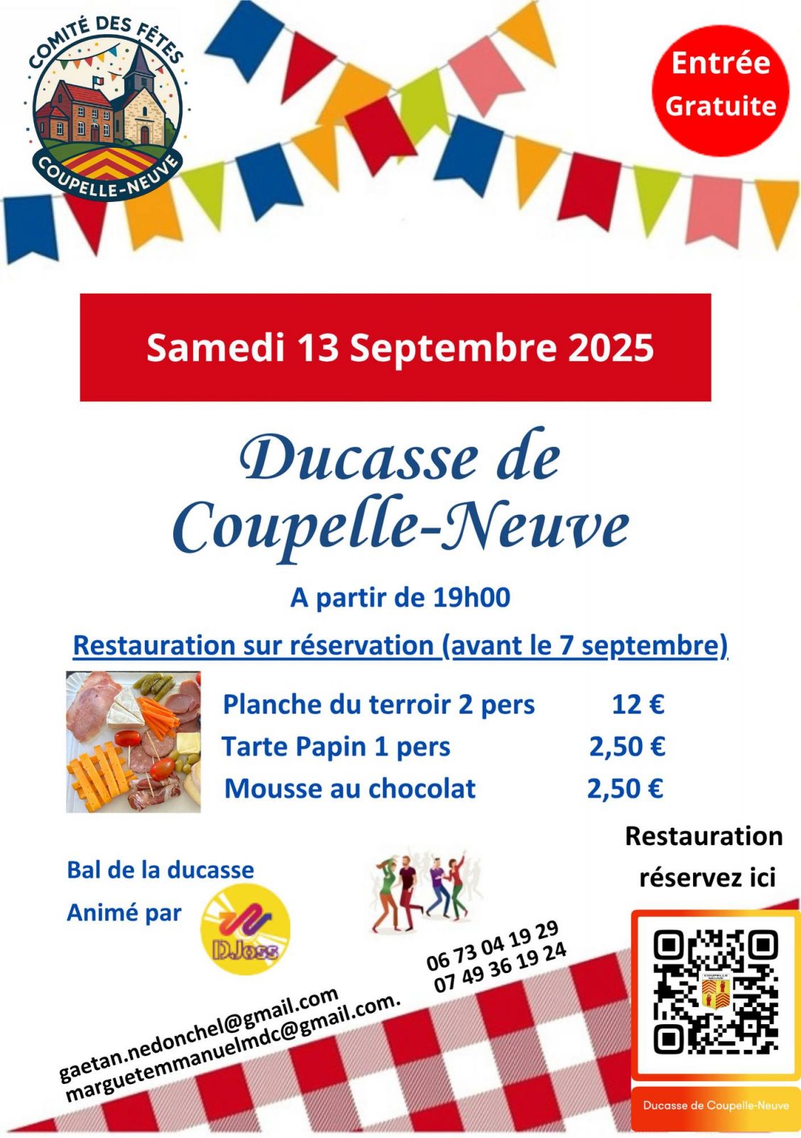À propos Retour à la liste La Comité des Fêtes de Coupelle-Neuve organise sa ducasse.Bal de la ducasse animé par le DJoss.Restauration sur place (réservation avant le 7 septembre)