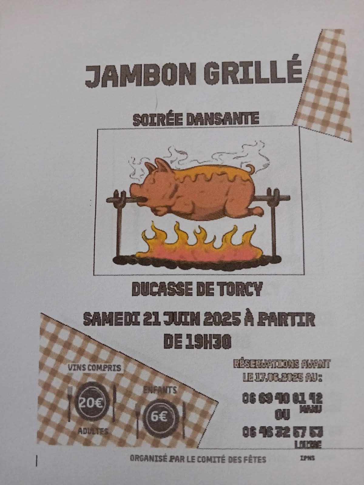 À propos Retour à la liste Le Comité des Fêtes de Torcy organise sa ducasse autour d'un jambon grillé et une soirée dansanteRendez-vous le samedi 21 juin à partir de 19h30Réservation avant le 17 juin