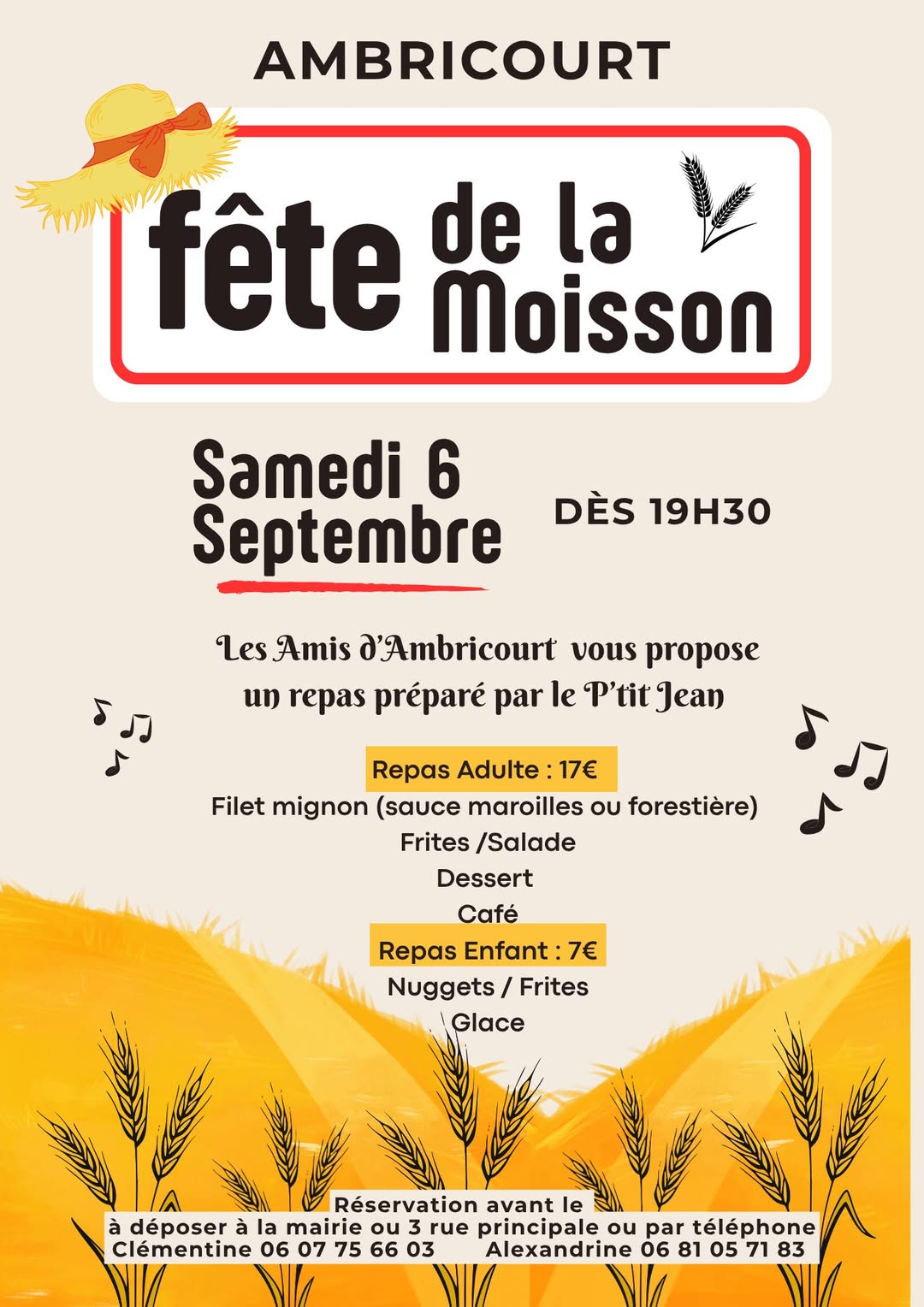 À propos Tarifs Retour à la liste Les Amis d'Ambricourt organise la Fête de la Moisson à AmbricourtRendez-vous le samedi 6 septembre à partir de 19h30Repas adulte : 17€ - Repas enfant : 7€Sur réservation Tarifs Tarif Min. Max. Adulte - Tarif Repas 0€ 17€ Enfant - Tarif Repas 0€ 7€