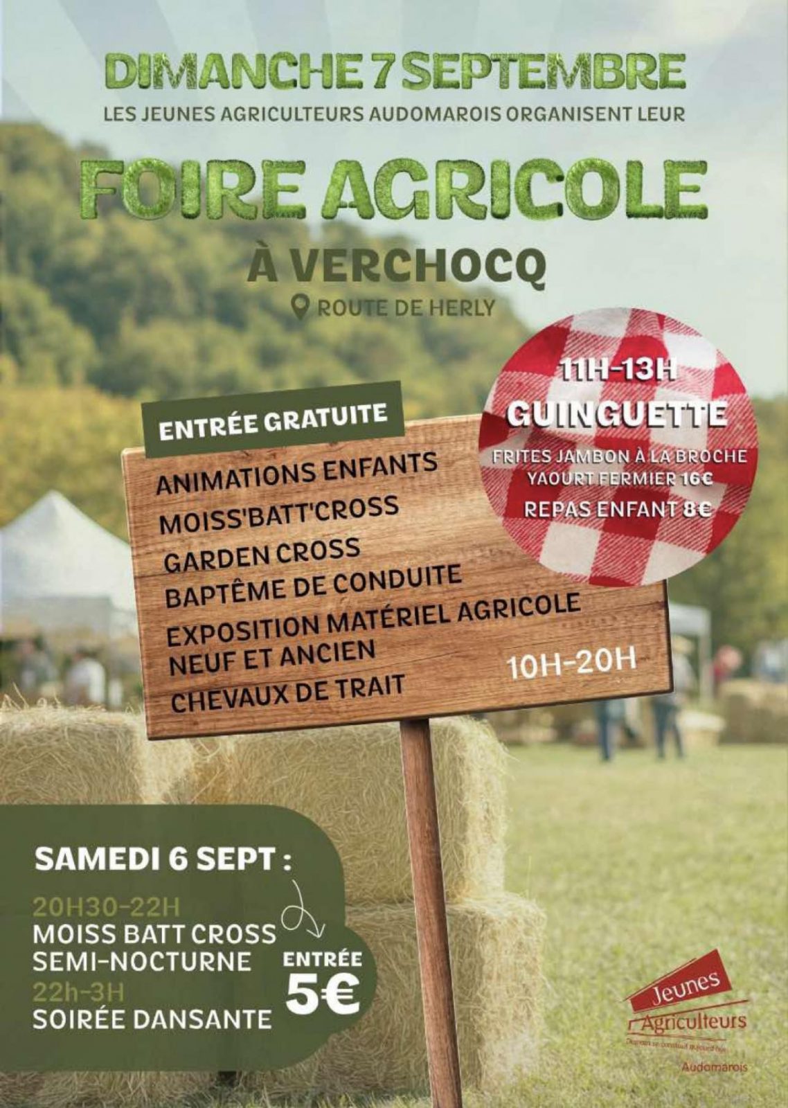 À propos Retour à la liste Les Jeunes Agriculteurs Audomarois organisent leur foire agricole à VerchocqRendez-vous le samedi 6 septembre dès 20h30 et le dimanche 7 septembre à partir de 10h
