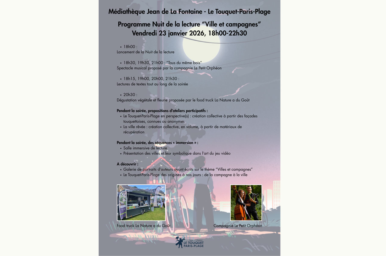 3 À propos Retour à la liste Organisées pour la cinquième année consécutive par le Centre National du Livre (CNL) sur proposition du ministère de la Culture pour célébrer le plaisir de lire, la « Nuit de la lecture » revient le vendredi 23 janvier 2026 à la médiathèque sur le thème « Les patrimoines ».