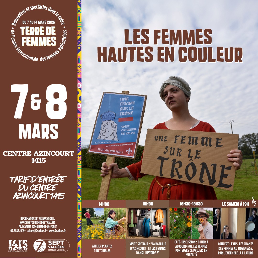 4 À propos Tarifs Retour à la liste Samedi 7 mars -AZINCOURT - animations au Centre Azincourt 141514h : atelier plantes tinctoriales. 15h : visite spéciale ‘La Bataille d'Azincourt et les femmes dans l'histoire ?’. Résa non oblig. Tarifs du centre. 16h30-18h30 : café-discussion ‘d'hier à aujourd'hui, les femmes porteuses de projets en ruralité’. 19h : concert ‘Exils, les chants des femmes au Moyen Âge’ par l'ensemble La Filature. Centre Azincourt 1415 24, rue Charles VI +33 (0)3 74 63 00 24 contact@azincourt1415.com https://azincourt1415.com/ Tarifs Tarif Min. Max. Demandeur d'emploi 0€ 7,50€ Etudiant 0€ 7,50€ Groupe adulte - par personne 0€ 6€ Groupe enfant - par enfant 0€ 4€