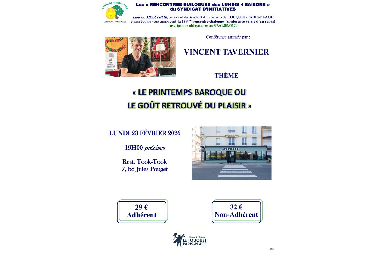 3 À propos Retour à la liste LES JEUDIS DU TAROT DU SYNDICAT D’INITIATIVES A tous les « taroteurs » passionnés ou amateurs, venez nous rejoindre tous les jeudis de 14h à 18h à la Maison des Associations pour « taper le carton » dans une ambiance très conviviale.Lundi 23 février 2026A 19h, suivi d’un repas au restaurant Took Took."Le printemps baroque ou le goût retrouvé du plaisir".Lundi 30 mars 2026A 19h, suivi d’un repas au restaurant l'Escale."L'histoire des fusées, de la poudre à canon au starship".Lundi 27 avril 2026A 19h, suivi d'un repas au Grand Hôtel"Plaisance en Manche en partant du TouquetLundi 18 mai 2026A 19h, suivi d'un repas au restaurant Marée Basse"Sciences fiction depuis 1880"Lundi 29 juin 2026A 19h, suivi d'un repas au restaurant Casseroles et Bouchons"Brassens"Lundi 28 septembre 2026A 19h, suivi d'un repas dans un restaurant TouquettoisLundi 26 octobre 2026A 19h, suivi d'un repas dans un restaurant TouquettoisInscriptions obligatoires pour toutes les conférencesTarifs : adh 27€ et Non –Adh 30€.