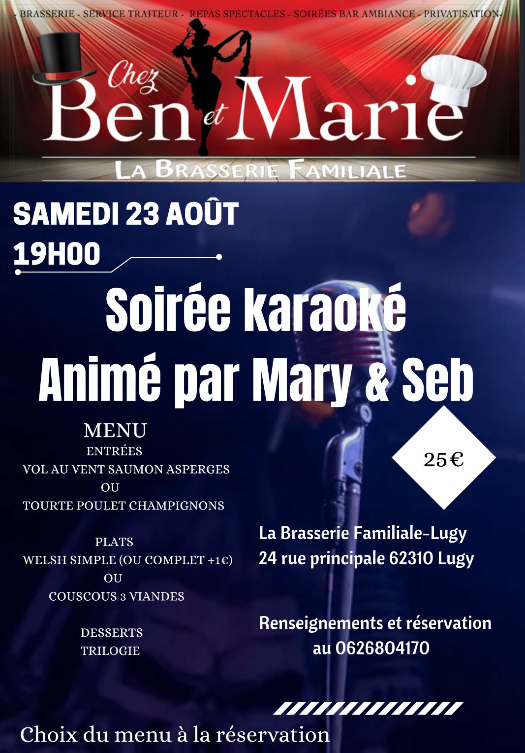 À propos Tarifs Retour à la liste La Brasserie Familiale de Lugy organise une soirée karaoké animée par Mary & Séb. Choix du menu à la réservation. Tarifs Tarif Min. Max. Tarif 0€ 25€