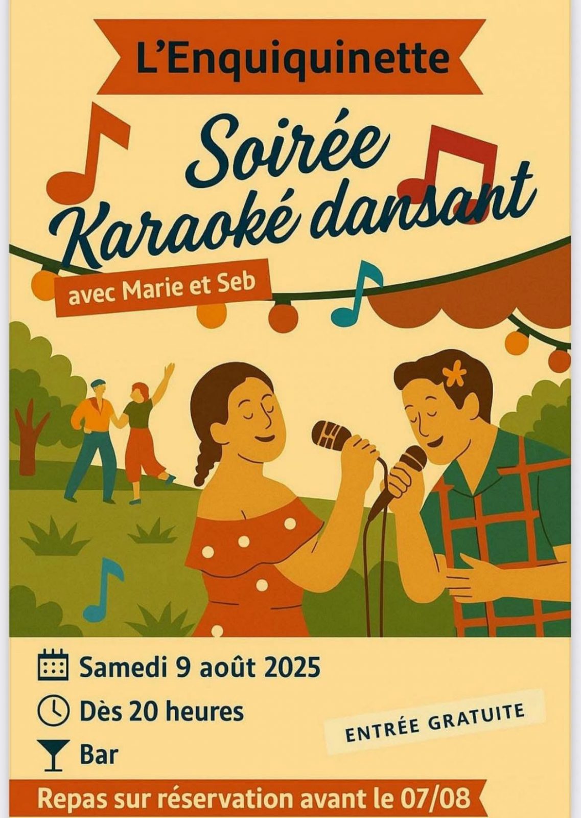 À propos Retour à la liste L'Enquiquinette vous propose une soirée karaoké dansantRendez-vous le samedi 9 août à partir de 20h