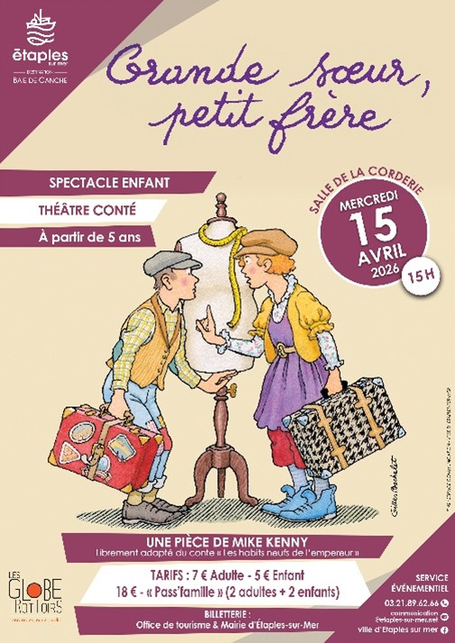 À propos Tarifs Retour à la liste Une aventure théâtrale ébouriffante ! Suivez Rita et Archie, un frère et une sœur aussi complices qu’insupportables, dans leur fuite effrénée. Leur crime ? Avoir berné un empereur vaniteux avec une supercherie mémorable ! Entre un ministre ridicule, une impératrice éblouissante et une cour crédule, le piège était parfait... jusqu’à ce que la vérité éclate : l’empereur est nu. Mais alors, à qui la faute ? Entre chamailleries fraternelles et mauvaise foi hilarante, les deux garnements se rejettent la responsabilité de ce fiasco. Une réécriture vive et ludique du célèbre conte d'Andersen, qui interroge avec humour et tendresse les liens de fraternité et la valeur de l'honnêteté. A partir de 5 ans. Informations supplémentaires : Par le service évènementiel.Réservations : 03 21 89 62 73 ou à l'Office de Tourisme. Tarifs Tarif Min. Max. Adulte 0€ 7€ Enfant - Moins de 12 ans 0€ 5€ Tarif Famille nombreuses - (2 adultes et 2 enfants) 0€ 18€