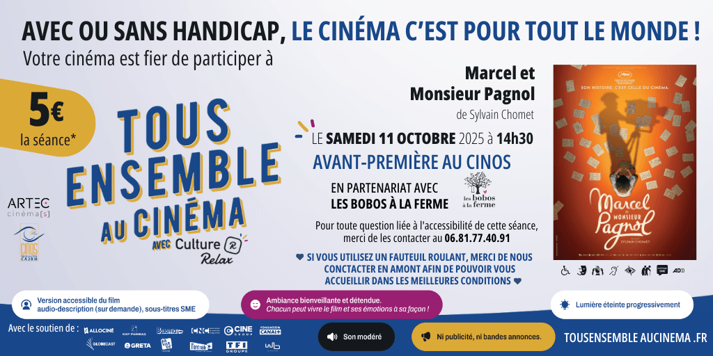 2 À propos Tarifs Retour à la liste Avec ou sans handicap, le cinéma c’est pour tout le monde ! Votre cinéma est fier de participer à « Tous ensemble au cinéma » avec Culture Relax, en partenariat avec Les Bobos à la Ferme.Pour toute question liée à l'accessibilité de cette séance, merci de les contacter au 06 81 77 40 91. Projection en avant-première du film « Marcel et Monsieur Pagnol » de Sylvain Chomet Si vous utilisez un fauteuil roulant, merci de contacter en amont afin de pouvoir vous accueillir dans les meilleures conditions. Tarifs Tarif Min. Max. Tarif 0€ 5€