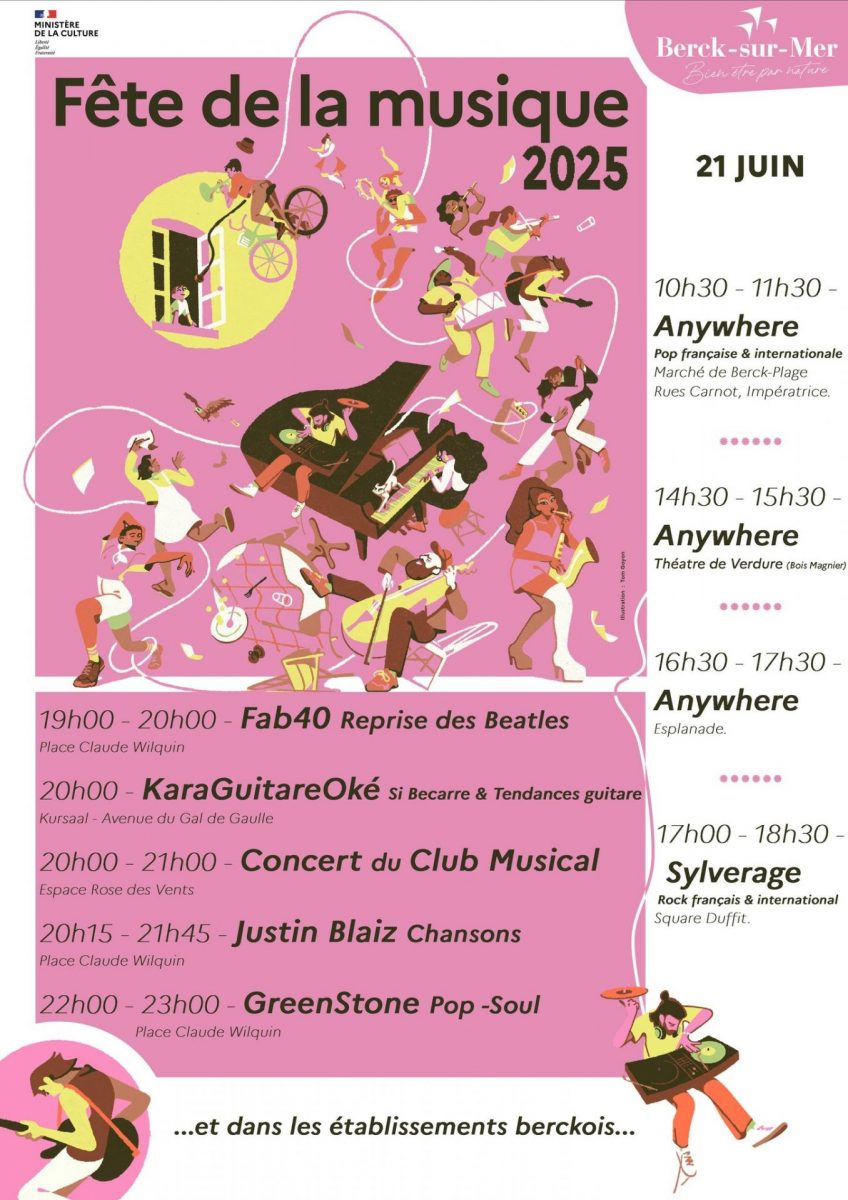 En famille Publié le 18 juin 2025 Chaque année, le 21 juin, la Fête de la Musique marque le passage à l’été en France. Sur la Côte d’Opale dans le Pas de Calais , cette célébration prend une ampleur toute particulière : elle ne dure pas seulement une journée, mais s’étale sur plusieurs dates, avec une multitude de concerts et d’animations organisés dans les villes et villages du littoral comme dans l’arrière-pays.Une fête musicale prolongée sur toute la Côte d’OpaleLa fête de la musique est l’occasion rêvée de découvrir des artistes locaux de la Côte d’Opale, de danser en plein air, de se balader dans des lieux insolites et de vibrer au rythme de tous les styles musicaux : pop, rock, électro, jazz, fanfares, variétés françaises, musiques du monde… Il y en a pour tous les goûts et tous les âges. Laissez-vous porter par l’ambiance festive et chaleureuse de cette fête dans les différents territoires de la Côte d’Opale.De Berck-sur-Mer à Le Touquet-Paris-Plage, en passant par Fruges, Étaples-sur-mer, Hucqueliers, Vieil-Hesdin ou encore Sainte-Cécile, chaque commune apporte sa touche personnelle à l’événement. Des scènes improvisées en plein centre-ville, des jardins patrimoniaux transformés en espaces acoustiques, des places animées par des DJ ou des guinguettes en plein air : la musique prend vie partout !L’événement s’étend sur plusieurs jours, parfois même une dizaine, ce qui vous permet de multiplier les expériences musicales, d’assister à plusieurs concerts, et de profiter pleinement de l’effervescence estivale, sans jamais avoir à choisir entre deux rendez-vous en même temps.Étaples-sur-Mer : une fête populaire et intergénérationnelleÀ Étaples-sur-mer, la Fête de la Musique est pensée comme un moment de partage et de convivialité, ouvert à tous les publics. Du 13 au 22 juin, la ville se transforme en un véritable village musical où les concerts, les spectacles de rue et les animations se succèdent.On y célèbre la musique dans toute sa diversité, en journée comme en soirée, pour permettre aux familles, aux curieux, aux passionnés et aux simples promeneurs de vivre l’événement à leur rythme. C’est dans cette ambiance chaleureuse, conviviale et résolument festive que la fête de la musique sur la Côte d’Opale prend tout son sens.📞 Pour plus d’infos : Service événementiel d’Étaples – 03 21 89 62 70© Ville d’Étaples-sur-merLe Touquet-Paris-Plage : élégance, ambiance et diversitéAu Touquet, du 20 au 22 juin, la musique s’invite dans tous les recoins de la station balnéaire chic. Concerts live, groupes acoustiques, déambulations musicales, artistes de rue… Tout est réuni pour un week-end festif sur la Côte d’Opale.Que vous soyez en balade sur le front de mer, en terrasse de café ou en plein cœur du marché, vous croiserez forcément un musicien ou une ambiance sonore. La ville propose une programmation riche et éclectique, accessible en ligne pour ne rien manquer.Accédez à l’agenda complet ici.© Le Touquet-Paris-PlageSainte-Cécile : des concerts en bord de merLe 21 juin, Camiers – Sainte-Cécile vous invite à vivre un moment unique ! À 18h30, le groupe Stayin’ Alive mettra l’ambiance au Parc de la Chaumière avec des reprises dansantes et festives. Puis à 21h, rendez-vous sur l’esplanade de Sainte-Cécile pour un concert explosif avec Fathson, un groupe à l’énergie communicative.La douceur des soirées de juin en bord de mer rendent l’expérience encore plus mémorable.Le Haut-Pays d’Opale s’anime pour la Fête de la musique !Dans les terres aussi, la Fête de la Musique bat son plein ! Le 21 juin, plusieurs communes proposent une soirée rythmée :À Fruges, direction le Café St Gilliet dès 20h30 pour un concert du groupe Charly & The Rollmops, ambiance blues-rock garantie ! Plus d’infosÀ Torcy, vous avez rendez-vous avec le groupe Melting Potes accompagné d’un repas moules-frites au Repère de Torcy. Une soirée idéale pour allier musique et gastronomie locale. Plus d’infosÀ Hucqueliers, la fanfare Lyre d’Hucqueliers animera la première partie de soirée avant de laisser place à un buffet à volonté à l’Auberge. Une formule parfaite pour une soirée entre amis ou en famille.Berck-sur-Mer : de la pop aux platinesÀ Berck-sur-mer, la fête va battre son plein dans tous les quartiers ! Le 21 juin, la ville propose un véritable tour d’horizon musical, avec des reprises des Beatles et de grands classiques rock, une ambiance pop française et internationale, des DJ sets avec un atelier d’initiation aux platines, l’orchestre de l’école de musique en ouverture.Les lieux phares comme le Kursaal, la Place Claude-Wilquin, le Square Duffit et l’Esplanade accueilleront les concerts pour une immersion musicale complète. Une belle occasion de découvrir Berck-sur-mer autrement, à travers le prisme de la musique.Les Ballades musicales en 7 Vallées !Dans les 7 Vallées, la Fête de la Musique prend un accent bucolique et poétique, avec des concerts organisés dans des lieux patrimoniaux ou en pleine nature :Le 21 juin, dès 10h, partez pour une balade musicale en famille à la Halte d’Autrefois à Hesmond. À 14h30, vivez une parenthèse suspendue avec un concert piano-voix dans le jardin des Sœurs Noires à Vieil-Hesdin. À 17h, direction Douriez pour un concert festif dans le jardin de la collégiale, un moment à ne pas manquer.Le 22 juin, le Théâtre de Verdure à Hesdin-la-Forêt accueille une guinguette joyeuse de 12h à 17h. Accordéons, ambiance champêtre, jeux pour enfants et bonne humeur garantis !Plus d’infos.La fête de la musique sur la Côte d’Opale : un rendez-vous fédérateur dans le Pas-de-Calais.La Fête de la Musique sur la Côte d’Opale est bien plus qu’un simple événement annuel : c’est une tradition, une invitation à se rassembler, à vibrer ensemble et à célébr